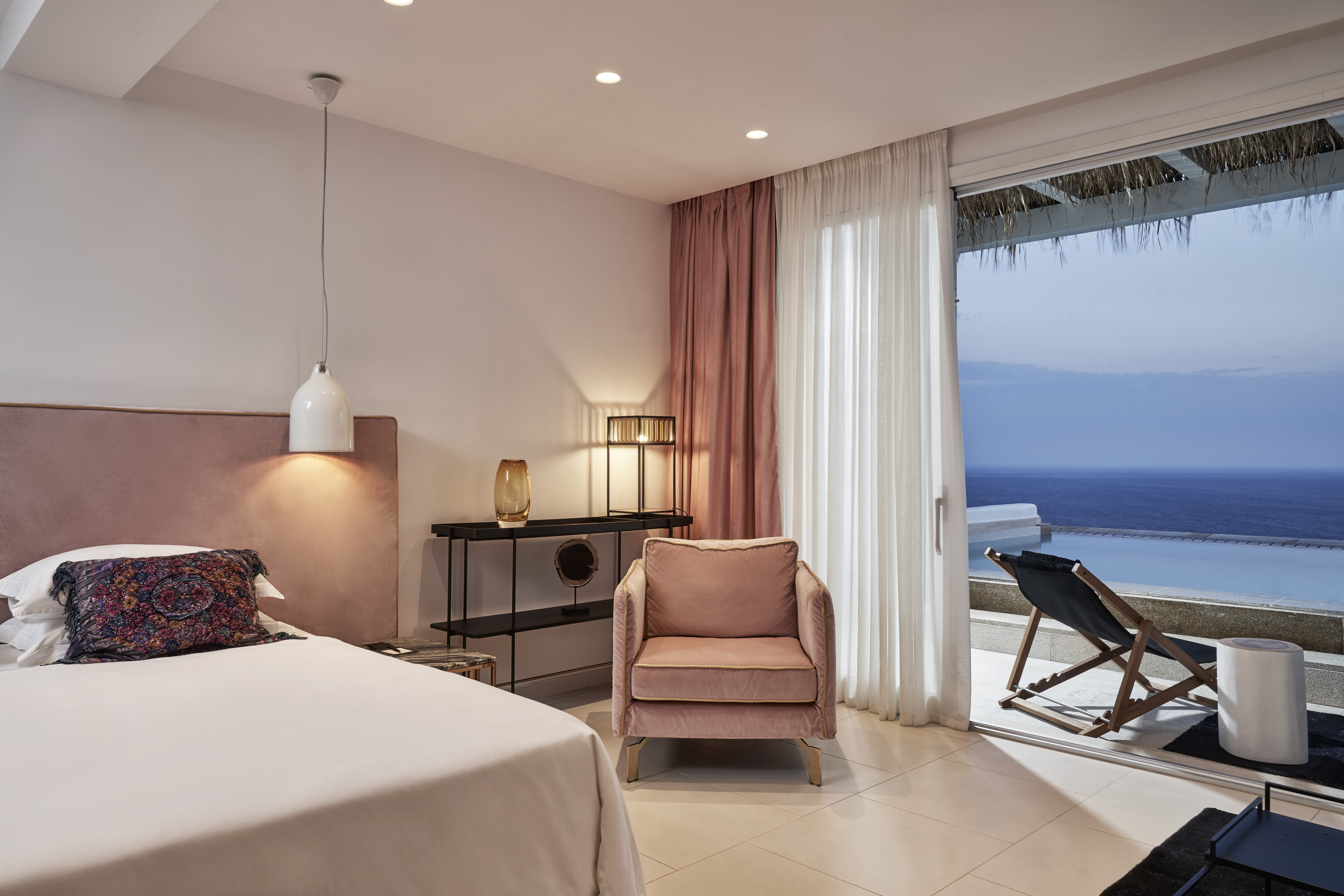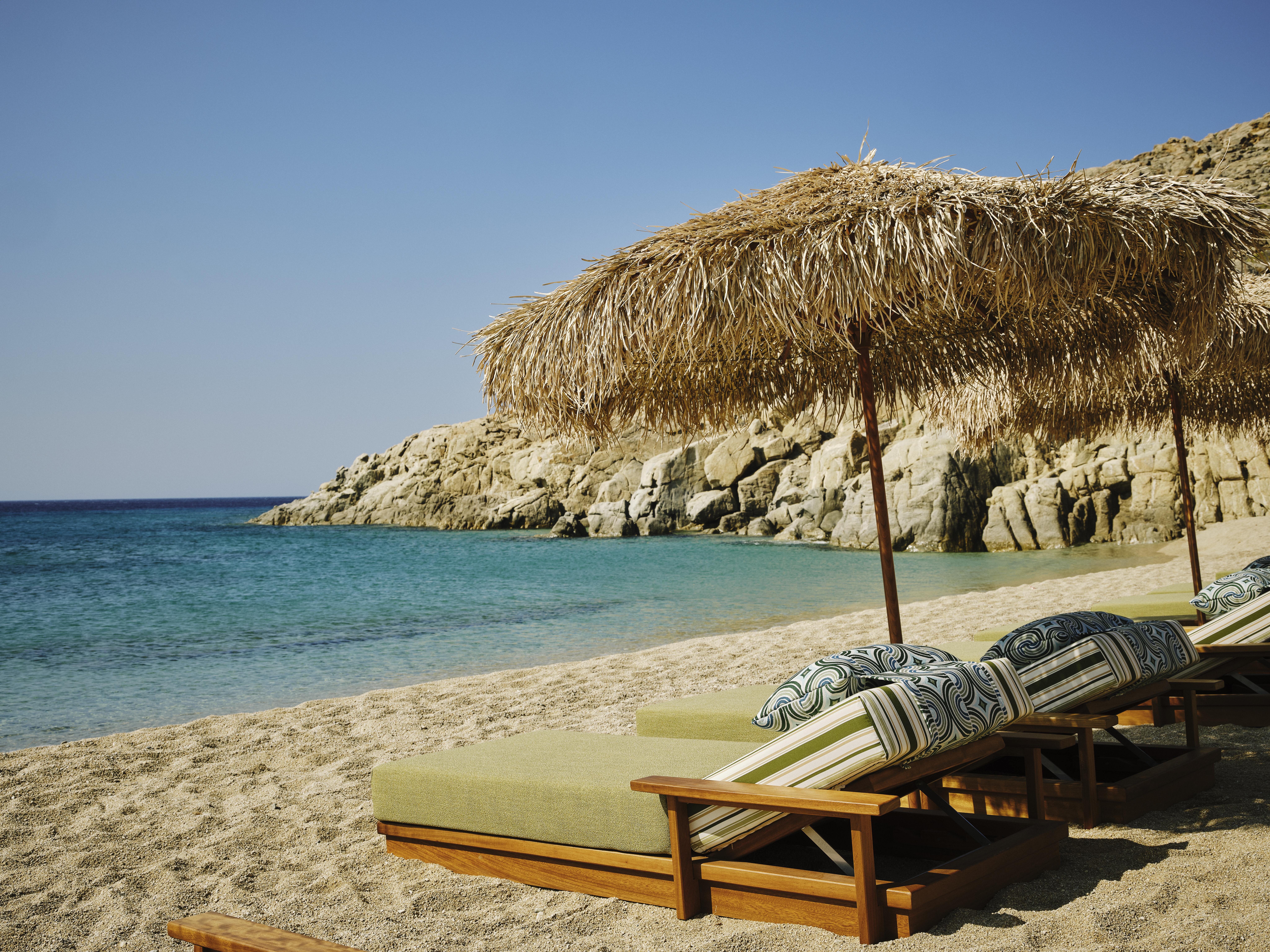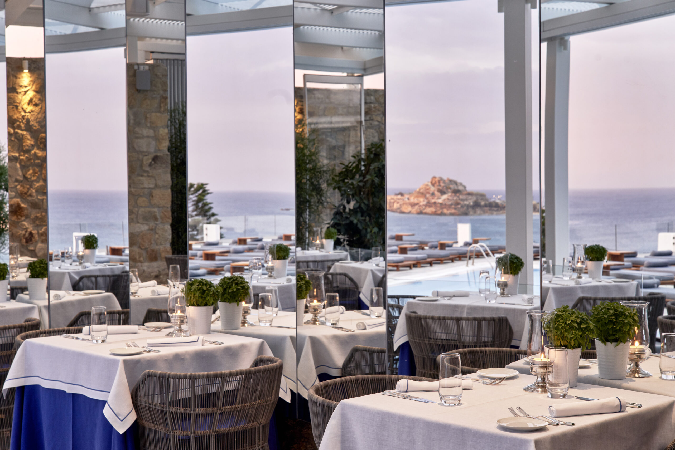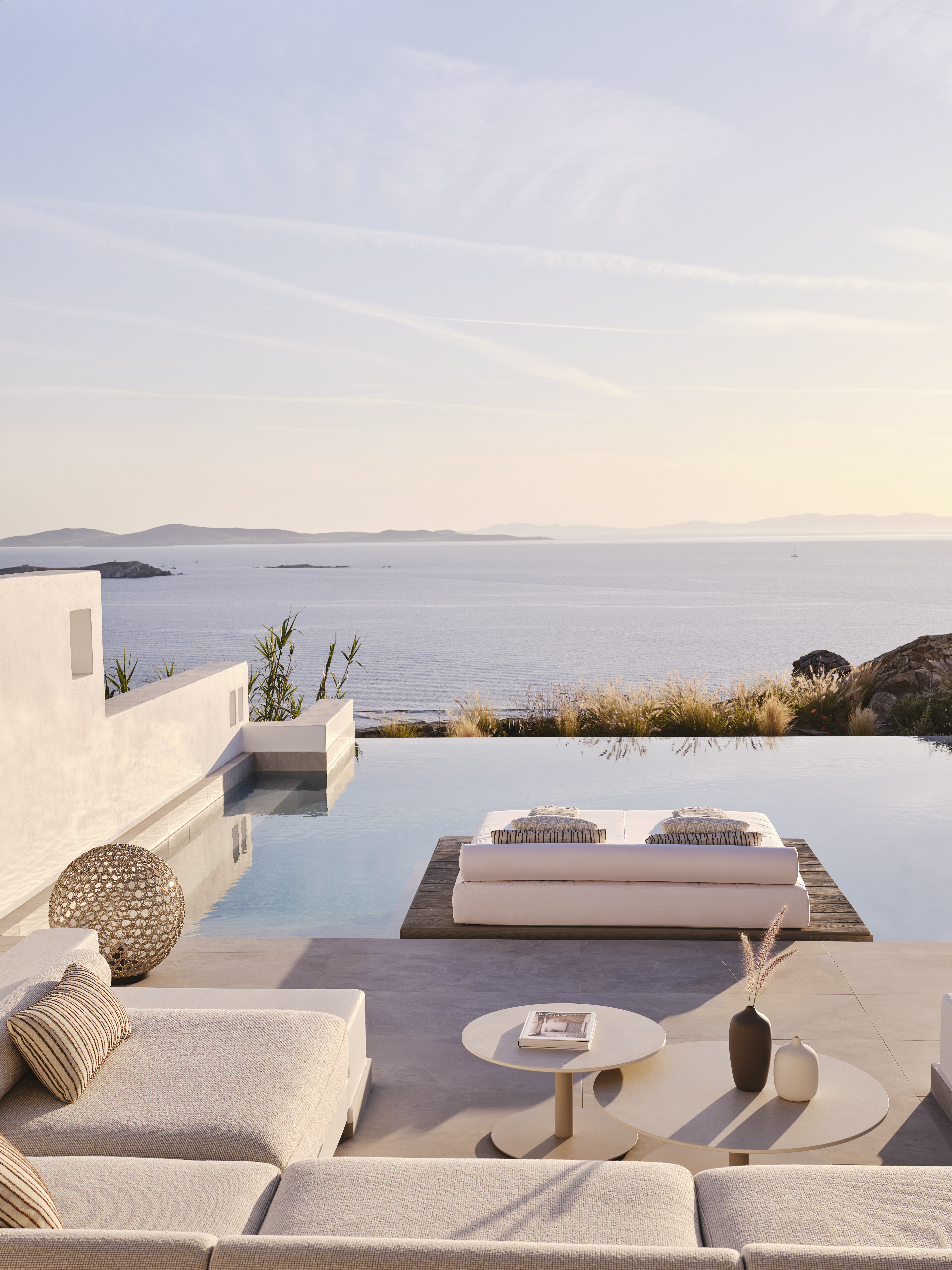 Ruhiger Strand, neues Design! Die Myconian Collection kündigt die Wiedereröffnung des neu gestalteten Sunrise Relais & Châteaux am Agrari Beach an. Das Design ist eine Reminiszenz an die 1970 Jahre und spielt mit den Formen und Farben der Ära, die Mykonos berühmt gemacht hat. Das Hotel, das sich seit langem in Familienbesitz befindet, wurde nicht nur komplett neugestaltet, sondern mit der Wiedereröffnung zugleich in die renommierte Hotel- und Restaurantvereinigung Relais & Châteaux aufgenommen, so dass das Haus auch kulinarisch ein neuer Hotspot auf Mykonos wird.