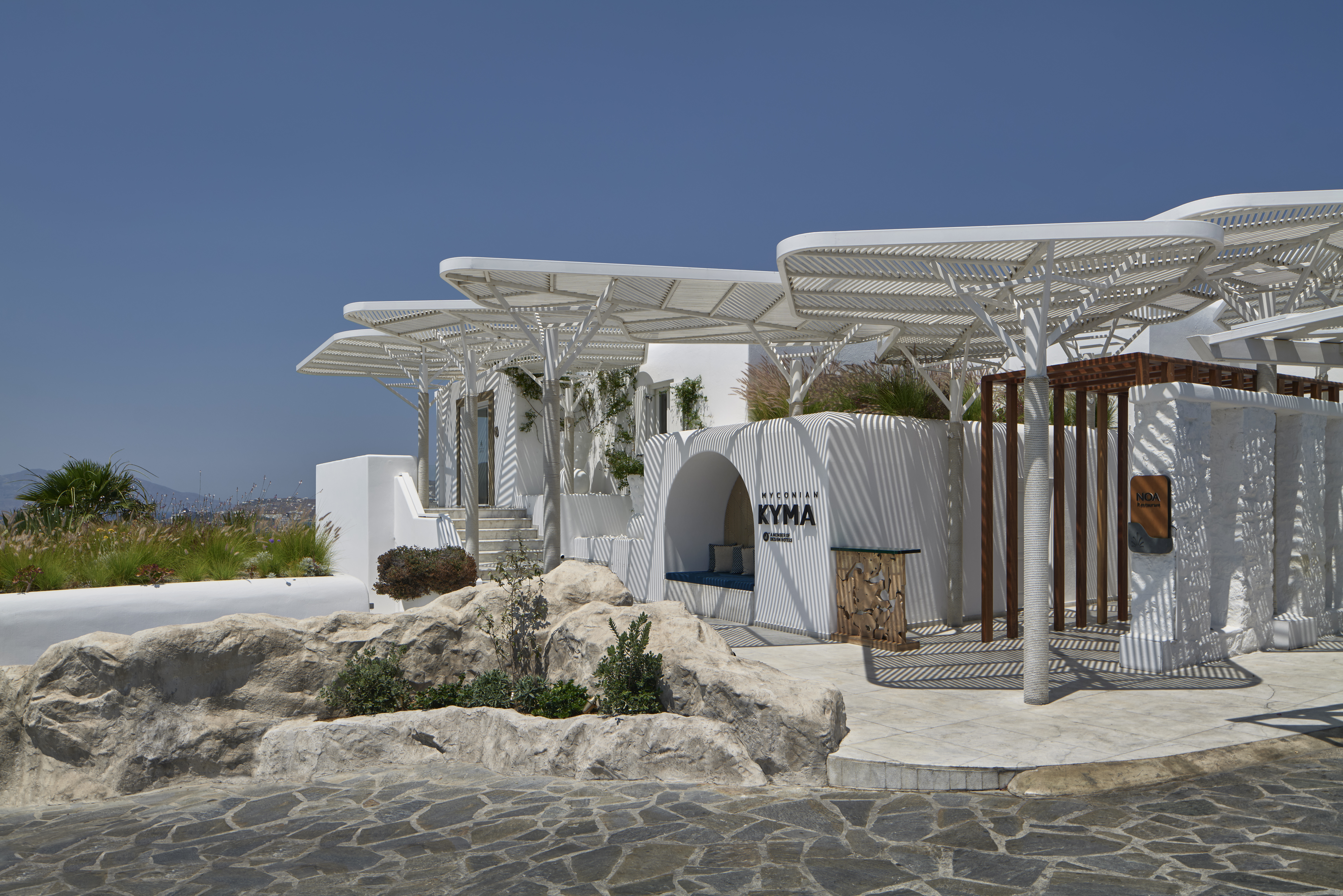 Nach der jüngsten Eröffnung des DEOS mit Blick bis zu den Nachbarinseln widmet sich die Myconian Collection 2025 dem „Sunrise“ an der Agrari-Bucht. Die Neugestaltung spielt mit der Ära, die Mykonos zum Sehnsuchtsort der Bohème machte: Die Beachbar Almiriki zitiert die 1970er Jahre mit lässigem Retro-Design. Parallel engagiert sich die Familie in der Region – für Schulen, archäologische Ausgrabungen und historische Bauten.