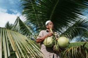 Along auf seiner Gemüsefarm, Yusup bei der Ernte von Pandan-Kokosnüssen und Mahyudi auf seiner Hühnerfarm (v.l.n.r.).