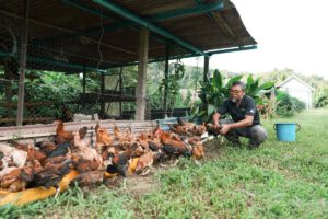 Along auf seiner Gemüsefarm, Yusup bei der Ernte von Pandan-Kokosnüssen und Mahyudi auf seiner Hühnerfarm (v.l.n.r.).