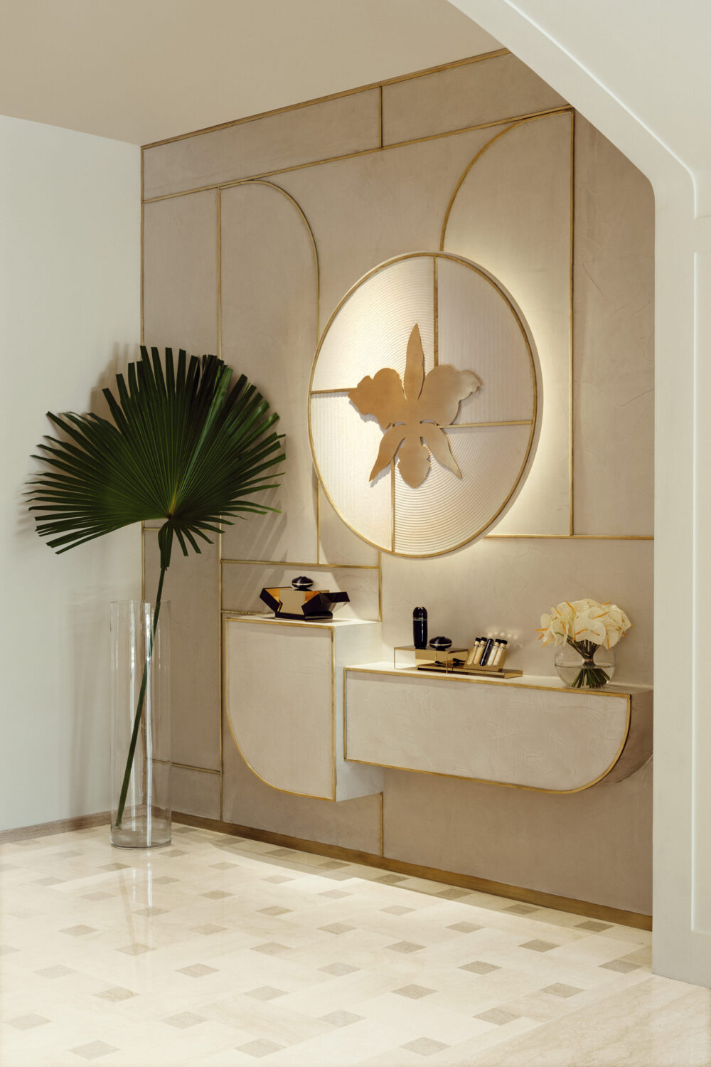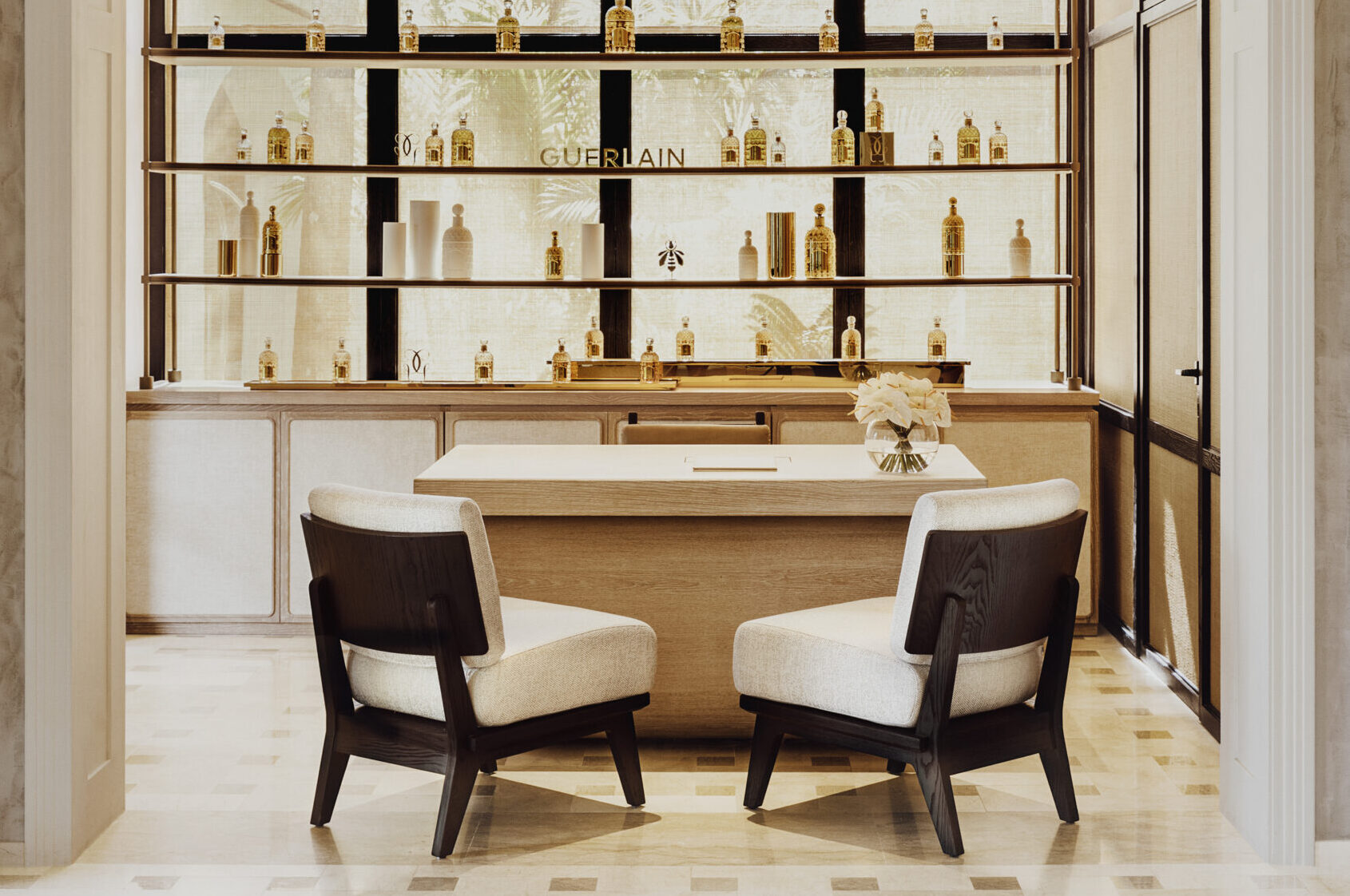 Ein Verkaufsbereich setzt das Guerlain-Erlebnis fort und bietet die Möglichkeit, bekannte Produkte der Marke zu erwerben, darunter die Rouge G-Lippenstifte, Hautpflegeprodukte wie die Kollektionen Orchidée Impériale und Abeille Royale, die exklusive Serie L’Institut 68 für Körperpflege sowie einzigartige Düfte.