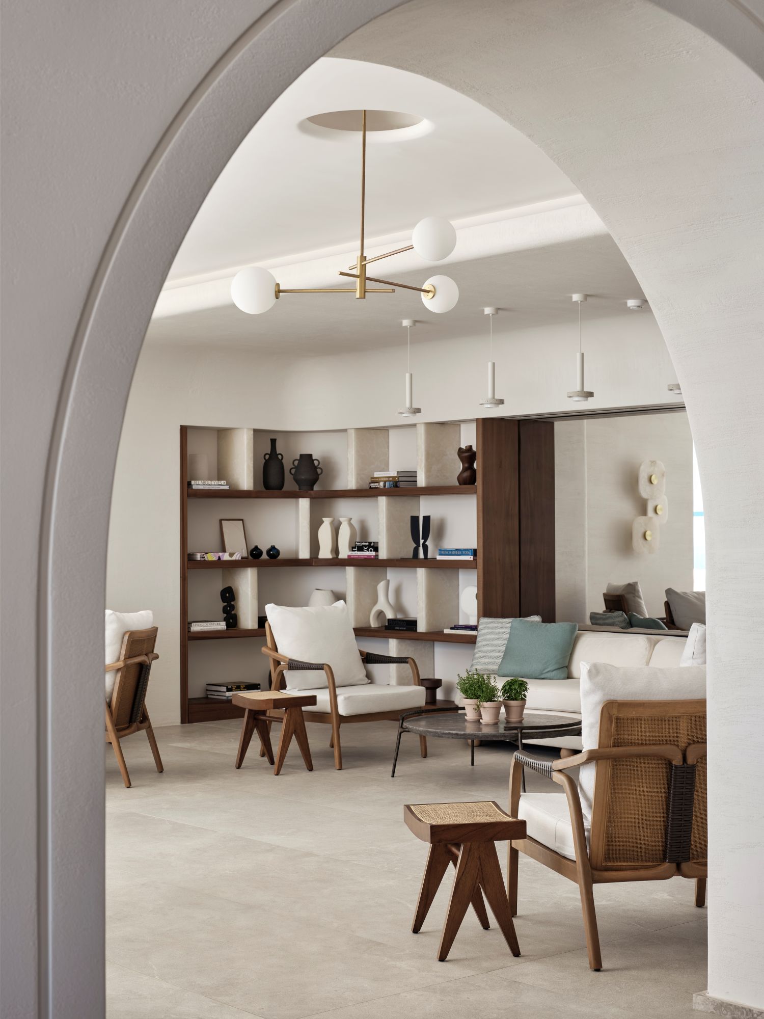 Auf einem 12.000 Quadratmeter großen Areal bewahrt das Boutiquehotel mit seinen nur 45 Zimmer das Gefühl eines Dorfes mit Gemeinschaftsplätzen, Grünflächen, privaten Pools und schattenspendenden Pergolen – eingebettet in ein botanisches Konzept, das auf endemische Pflanzen setzt. Ein besonderer Coup des Architekten: Alle Back-of-House-Bereiche verschwinden durch unterirdische Wege aus dem Blickfeld, sodass kein Blick durch funktionale Bereiche gestört wird. So profitiert nicht nur jedes Zimmer, sondern jeder öffentliche Bereich von einer offenen und weiten Aussicht. Bei Ankunft im Hotel, ist es das Panorama bis zu den Inseln Delos, Syros und Tinos, das alle Gäste in Empfang nimmt.
