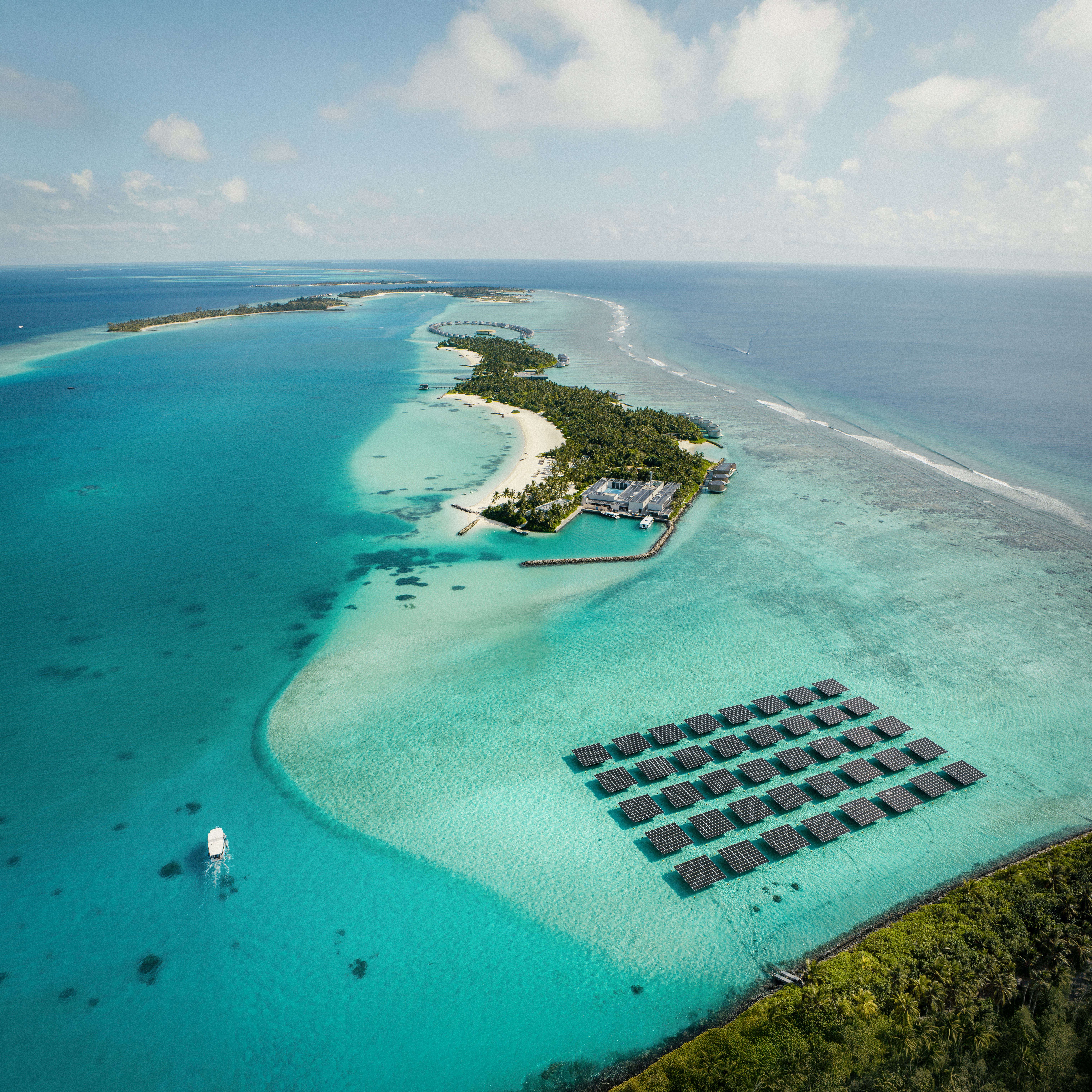 Das Ritz-Carlton Maldives, Fari Islands hat im September 2024 seine 61 Ocean Villas mit Solardächern ausgestattet und anschließend alle Back-of-House-Bereiche, das Restaurant Beach Shack und das Tauchzentrum, wodurch die Gesamtleistung der Solaranlage auf 983 kWp stieg. Im Jahr 2024 erhielt das Hotel zwei wichtige Umweltauszeichnungen, darunter die Green Globe-Zertifizierung 2024 für nachhaltige Praktiken und verantwortungsbewusste Gastfreundschaft sowie das Forbes VERIFIED Responsible Hospitality-Siegel, das an Hotels vergeben wird, die über 100 strenge Standards zum Schutz der Umwelt und zur Förderung des Wohlbefindens von Mitarbeitern, Gästen und lokalen Gemeinschaften einhalten. Oscar Postma, General Manager des The Ritz-Carlton Maldives, Fari Islands, kommentiert: „Wir sind unglaublich stolz darauf, ein Teil des einzigartigen Ökosystems der Fari Islands zu sein und uns dafür einzusetzen, dass unser ökologischer Fußabdruck gering ist und wir so einen großen Beitrag für den Erhalt unseres Planeten und unsere Gemeinschaft leisten. Da wir weiterhin investieren und innovativ sind, ist dies ein bedeutender Meilenstein in unserem Beitrag zu erneuerbaren Energien. Die unschätzbare Partnerschaft mit Swimsol bringt uns unserem gemeinsamen Ziel der Netto-Null Emissionen ein gutes Stück näher.“