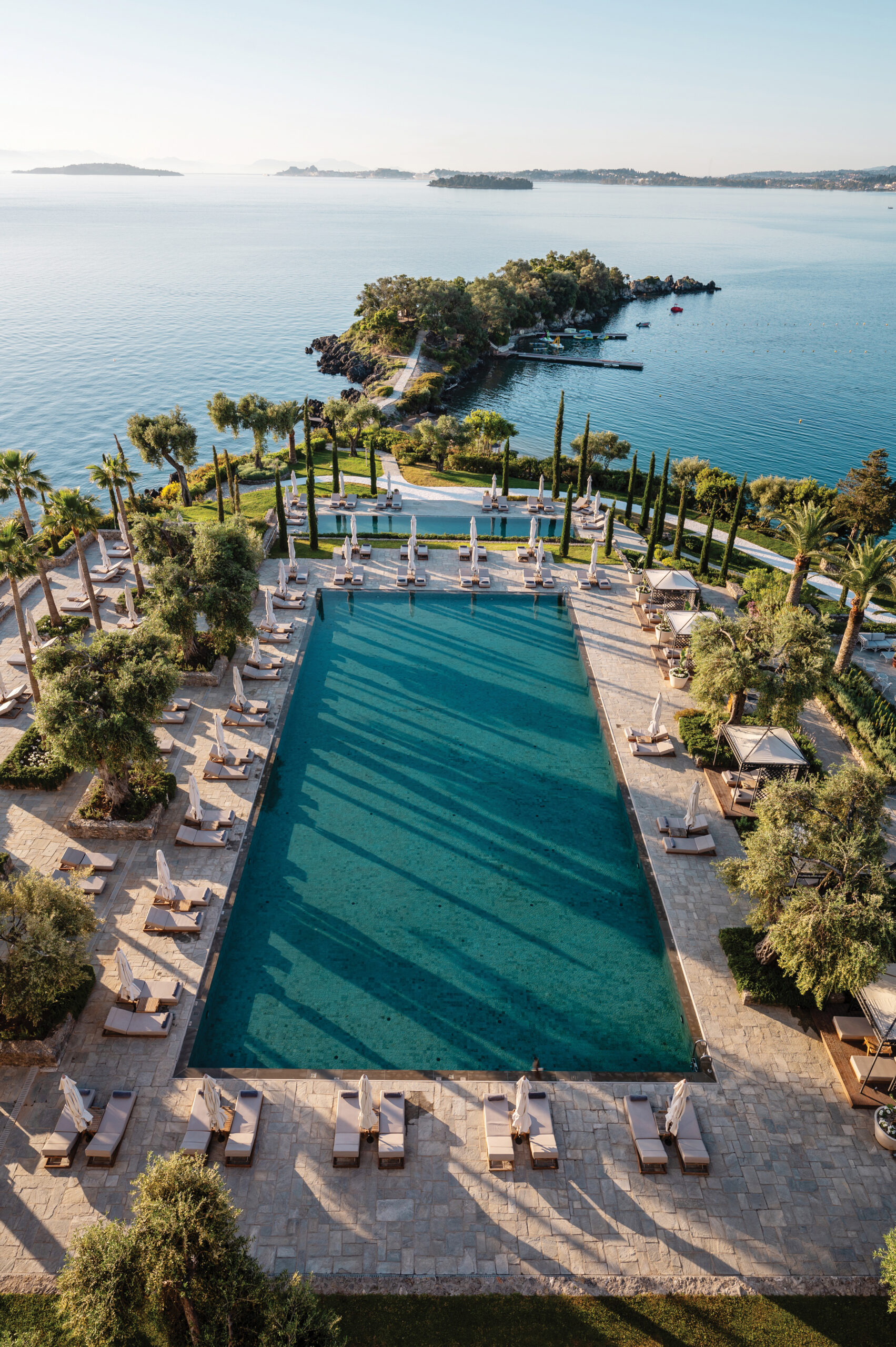 Am äußersten Ende der privaten Halbinsel Kommeno, eingebettet in Palmen und duftende Olivenbäume liegt der Palazzo Imperiale – eine Residenz, die ihrem Namen gerecht wird und wie ein Palast über dem Wasser thront. Die Residenz ist von drei Seiten vom Ionischen Meer umgeben, sodass Gäste im 55 Quadratmeter großen Infinity-Pool scheinbar endlos dem Horizont entgegenschwimmen. Die zweistöckige Villa mit 245m2 Innen- und fast 300m2 Außenfläche vereint klassische Eleganz mit griechischem Lebensgefühl: hohe Decken, lichtdurchflutete Wohnräume und Marmorterrassen erinnern an einen Palazzo, während eine kleine Steintreppe unterhalb des Pools direkt vom Garten zu einer privaten Badeplattform führt – ein exklusiver Ort, um morgens ins kristallklare Meer zu springen. Mit Platz für bis zu acht Erwachsene, mehreren luxuriösen Schlafzimmern, separaten Wohn- und Arbeitsbereichen sowie eigenen Personalräumen ist der Palazzo Imperiale ein Refugium für alle, die Privatsphäre schätzen. Wer mag, lässt sich per Tenderboot direkt am Privatsteg der Villa absetzen. Das Corfu Imperial gilt als eines der eindrucksvollsten Resorts Griechenlands mit seinen mediterranen Gärten, eleganten Marmorpromenaden an versteckten Buchten und kleinen Boutiquen, die lokales Kunsthandwerk anbieten. Gäste dürfen sich auf ein umweltbewusstes Aktivitätenprogramm freuen – von Minigolf mit biologisch abbaubaren Golfbällen bis hin zur Möglichkeit, eine Koralle im Ionischen Meer zu adoptieren und so zum Erhalt der Unterwasserwelt beizutragen. Weitere Informationen unter www.corfuimperial.com. Bildmaterial finden Sie hier.
