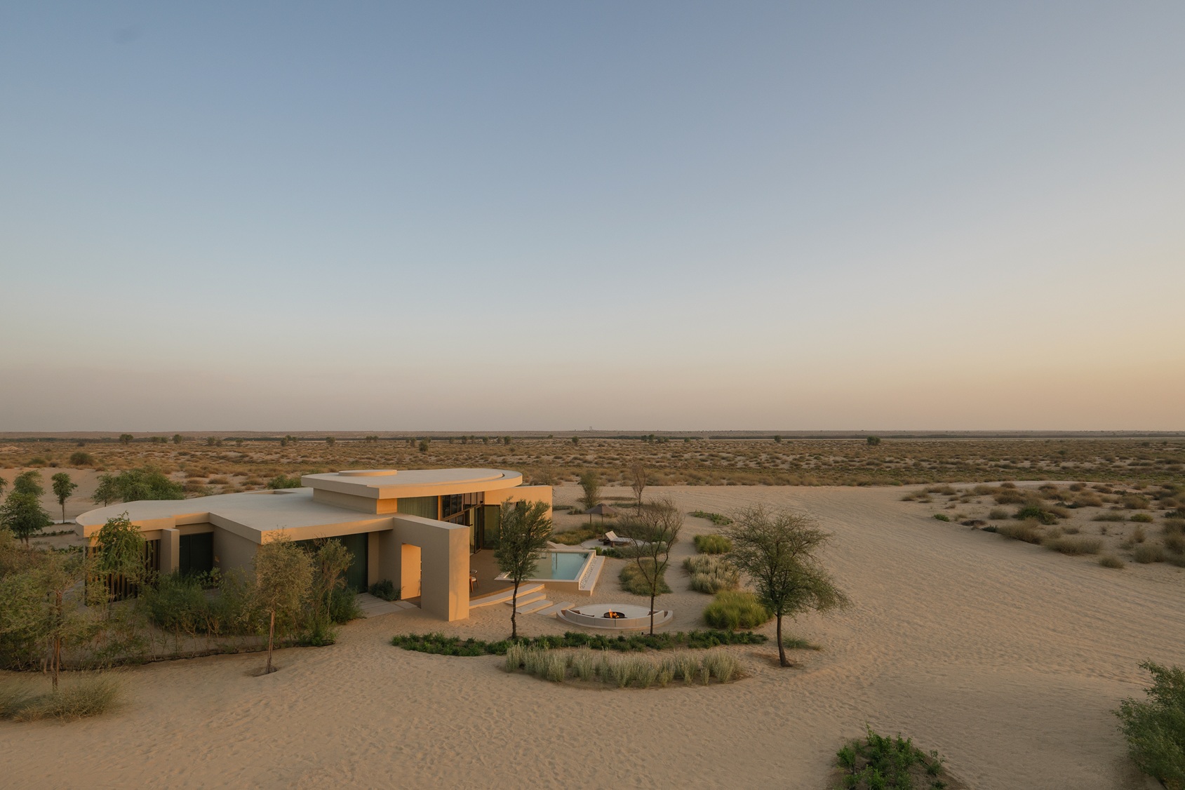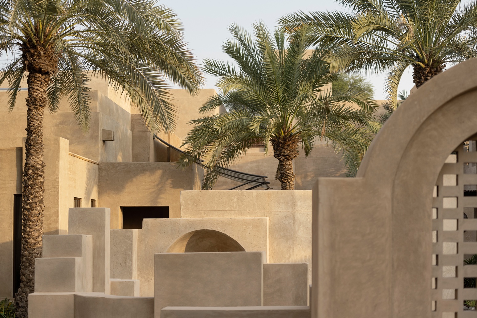 Auch die Landschaftsgestaltung greift lokale Bezüge auf: Neben Palmen prägen Ghaf Trees das Anwesen und seine Umgebung – eine einheimische Baumart, die als Nationalsymbol der Vereinigten Arabischen Emirate gilt. Kleine Wasserläufe und Wege erinnern an historische Falaj-Bewässerungssysteme und führen Gäste durch eine Umgebung, die eine Hommage an die Ruhe der Wüste ist.