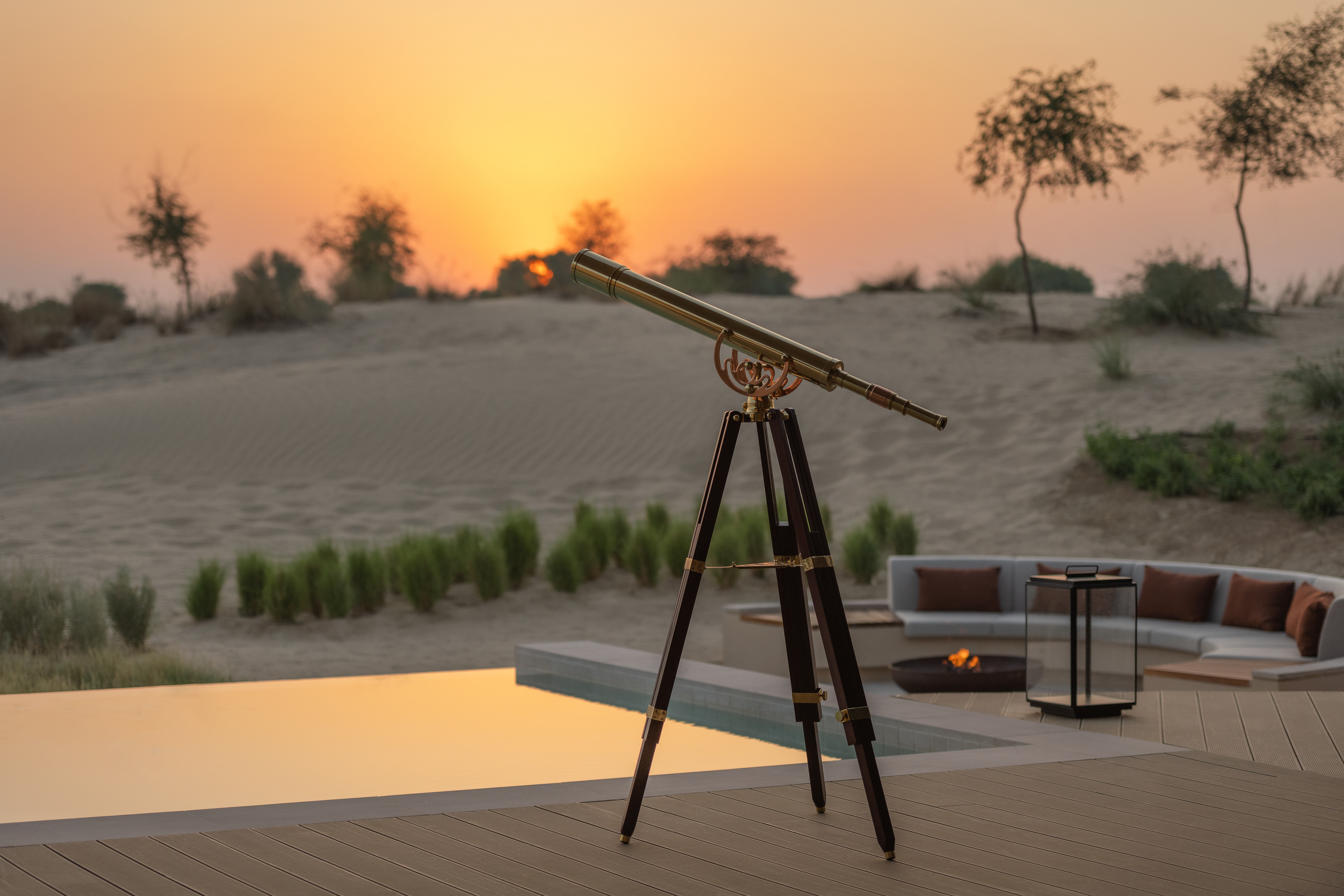 Mit einer Dauer von 60 Minuten ist das Erlebnis auch für Nachwuchs-Astronomen ab acht Jahren geeignet und eine kleine Gruppengröße von maximal zehn Gästen sorgt für eine persönliche Atmosphäre und Raum für Fragen. Der abgelegene Wüstenstandort von Bab Al Shams bietet einen klaren Blick auf das Firmament – dort, wo kein künstliches Licht den Zauber der Sterne stört. Die Gäste nehmen in einer traditionellen Majlis-Runde, mit arabischem Kaffee und Erfrischungen, Platz, während der Astronom sie durch eine faszinierende Mischung aus Theorie und Praxis führt: Er interpretiert und erläutert ihnen die Sternbilder, die durch ein Teleskop genauer betrachtet werden können.